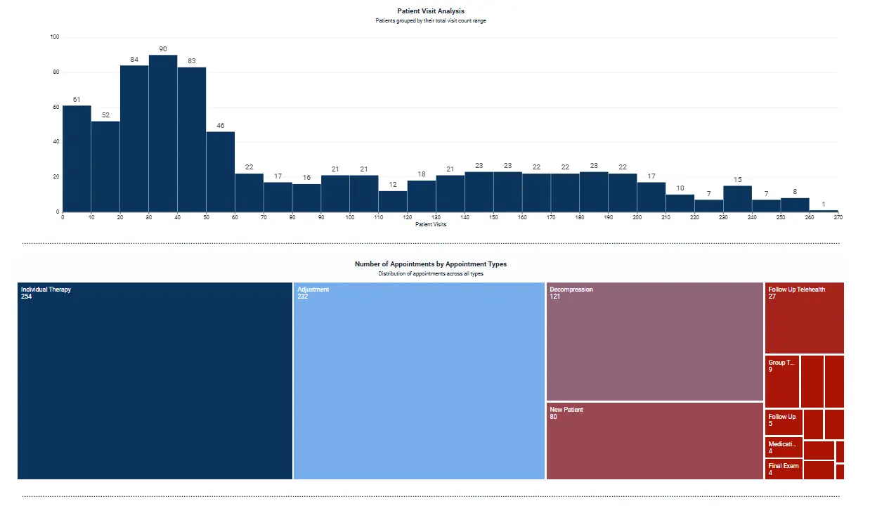 Complementing this is a tree-map visualization of appointment types providing an at a glance breakdown of which services (like Individual Therapy, Adjustments, or Decompression) drive the most volume.