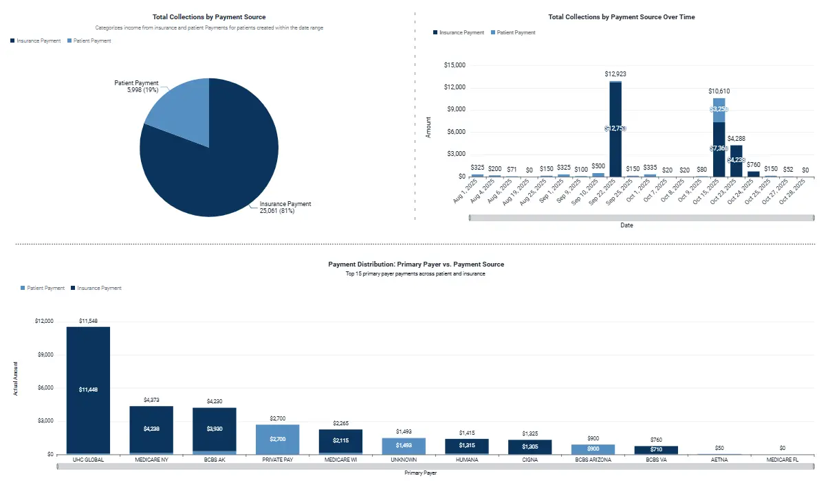 We’ve also introduced a primary-payer vs. payment source breakdown making it easy to see which payers contribute the most to your revenue stream and where patient-side balances are growing.