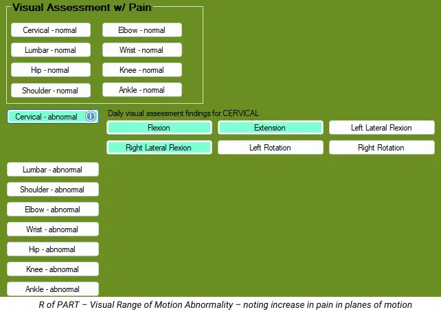 The R of PART stands for Range of Motion Abnormality. No one expects us to actually measure range of motion on every visit – we can save that for the exams. On the daily visits, though, we can simply do a visual assessment of range of motion, noting if there is an increase in pain for each plane of motion or not. Don’t make up fake measurements – there’s no need to do that here. If cervical flexion increases the pain when compared to neutral, it’s positive. That’s it.
