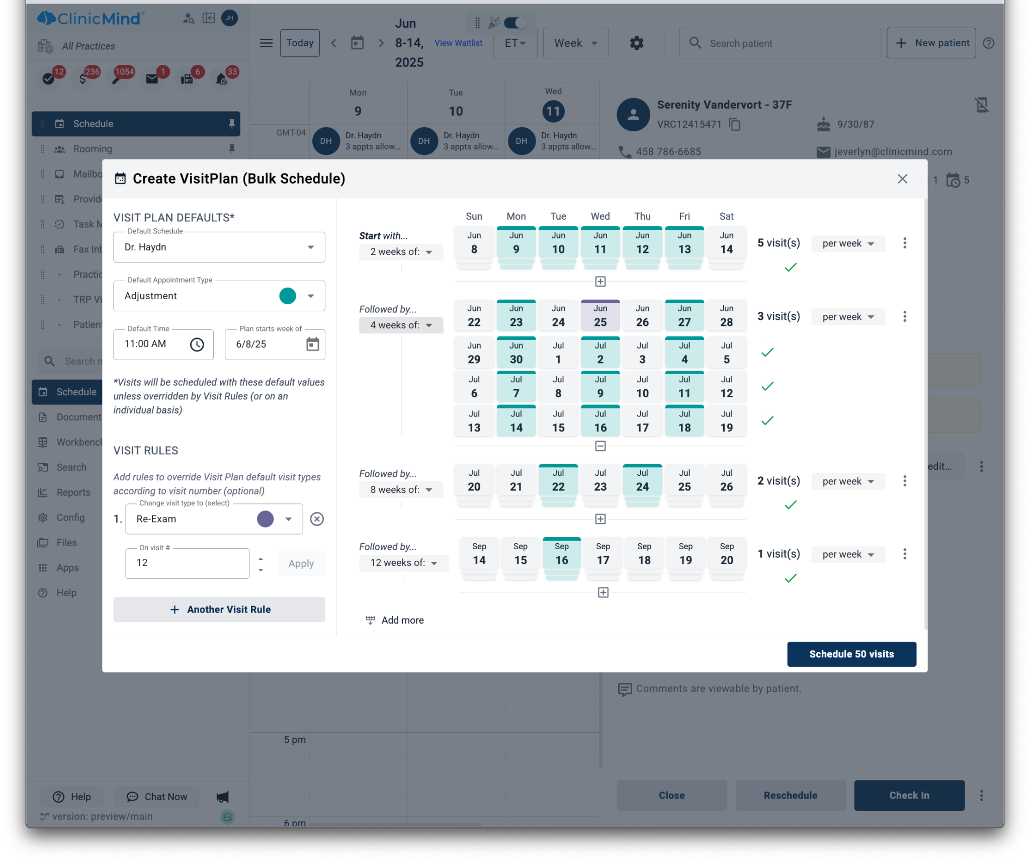 Design complex visit recurrence patterns—such as tapering from five visits a week to one—within a single interface. (Previously called “Bulk Schedule” in ClinicMind 1.0.)