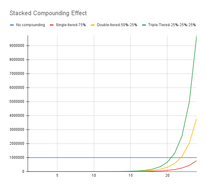 Although each compounding path uses the same total growth rate (75%), the outcome is dramatically different. The triple-tiered model outpaces all others—by millions.