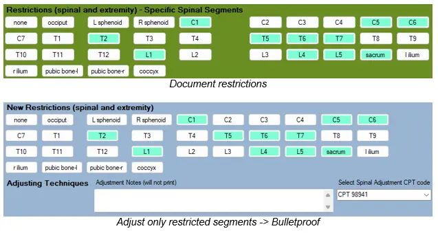If you perform an adjustment/CMT at C3, what is the justification for that? The simple answer is restriction/fixation/subluxation at C3. If you perform an adjustment/CMT to the right shoulder, the justification would be restriction/fixation/subluxation of the right shoulder. You also want to be sure there is asymptomatic complaint and diagnosis that corresponds to the finding. Think of it this way: symptom + finding + diagnosis = justification for treatment.